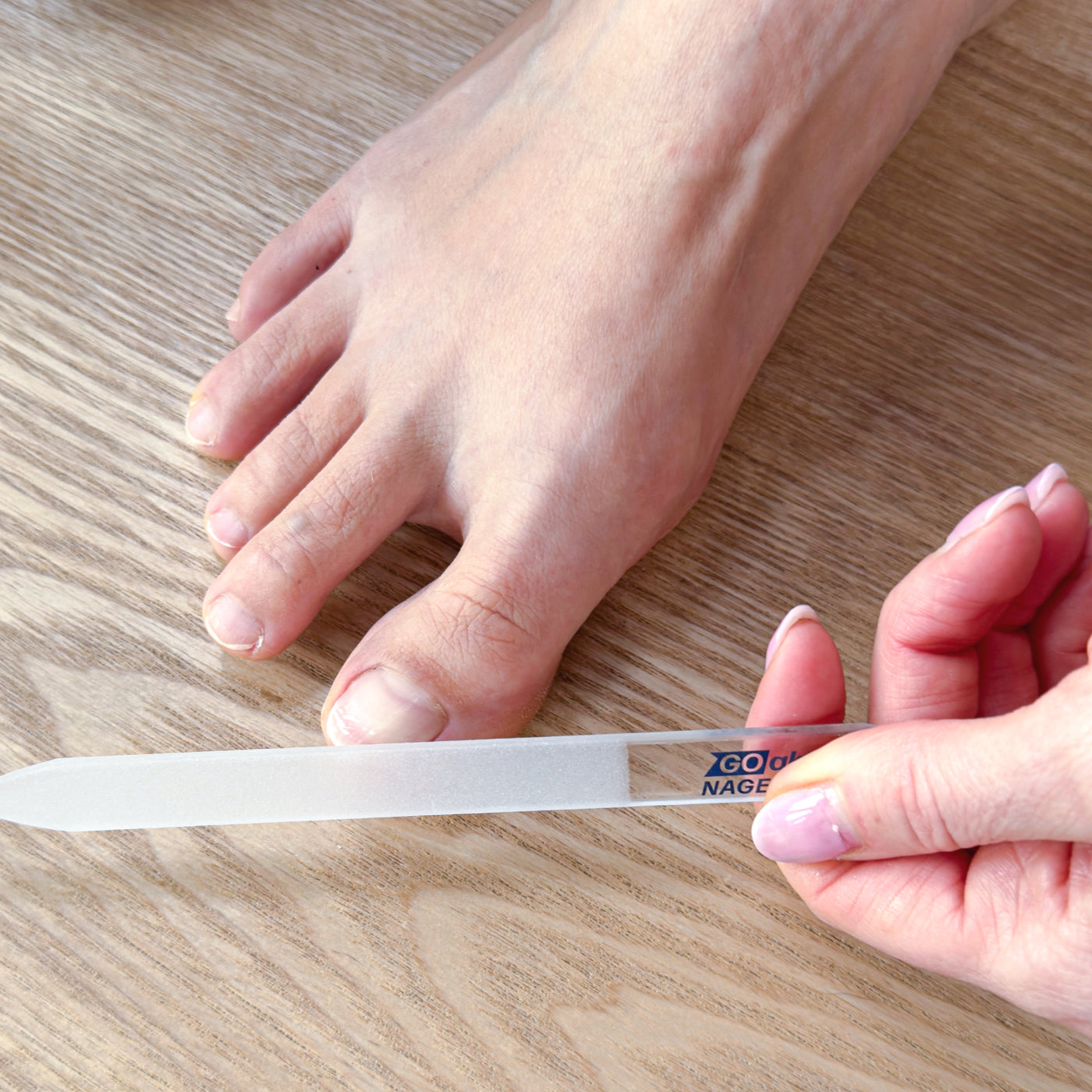 Den betroffenen Nagel gründlich reinigen. Der Nagel muss sauber, fettfrei und trocken sein. Überschüssiges lockeres Nagelmaterial vorsichtig abfeilen.