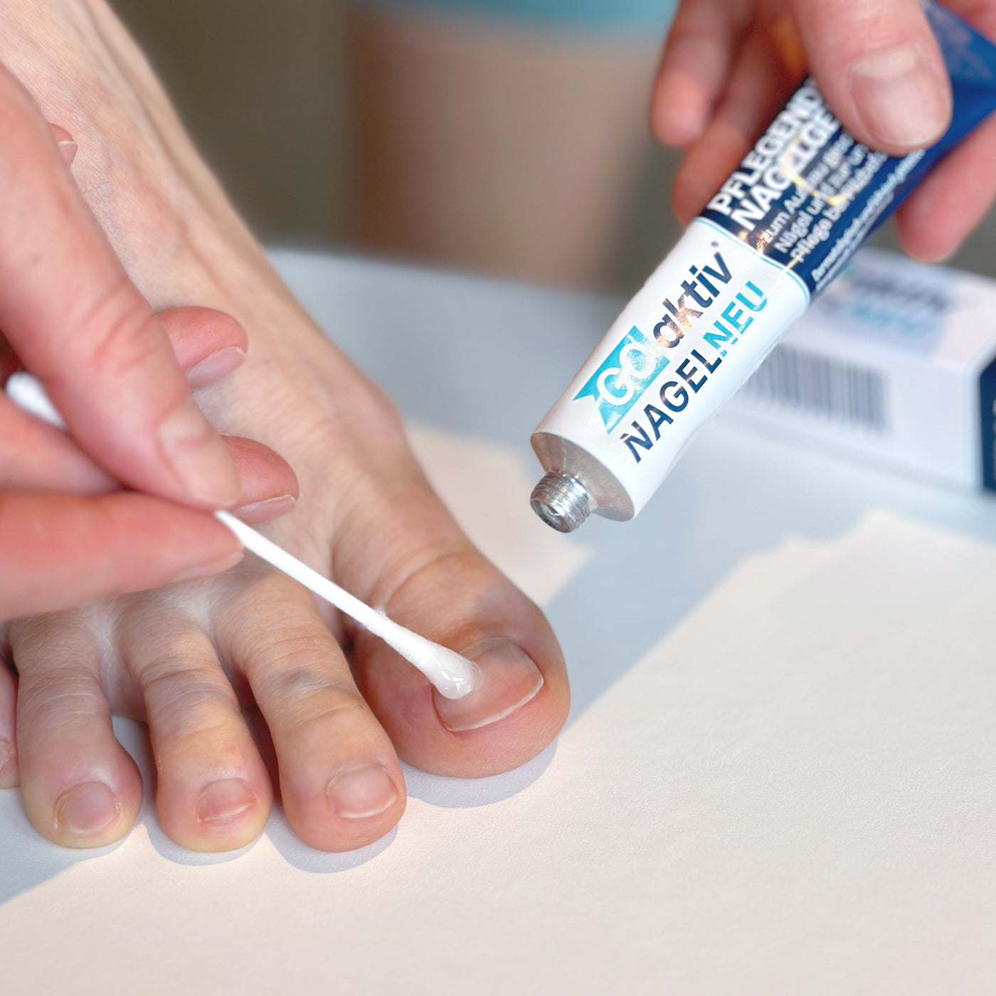 Eine kleine Menge NAGELNEU gezielt auf den betroffenen Nagel und entlang des Nagelrands auftragen (z. B. mit einem Wattestäbchen).